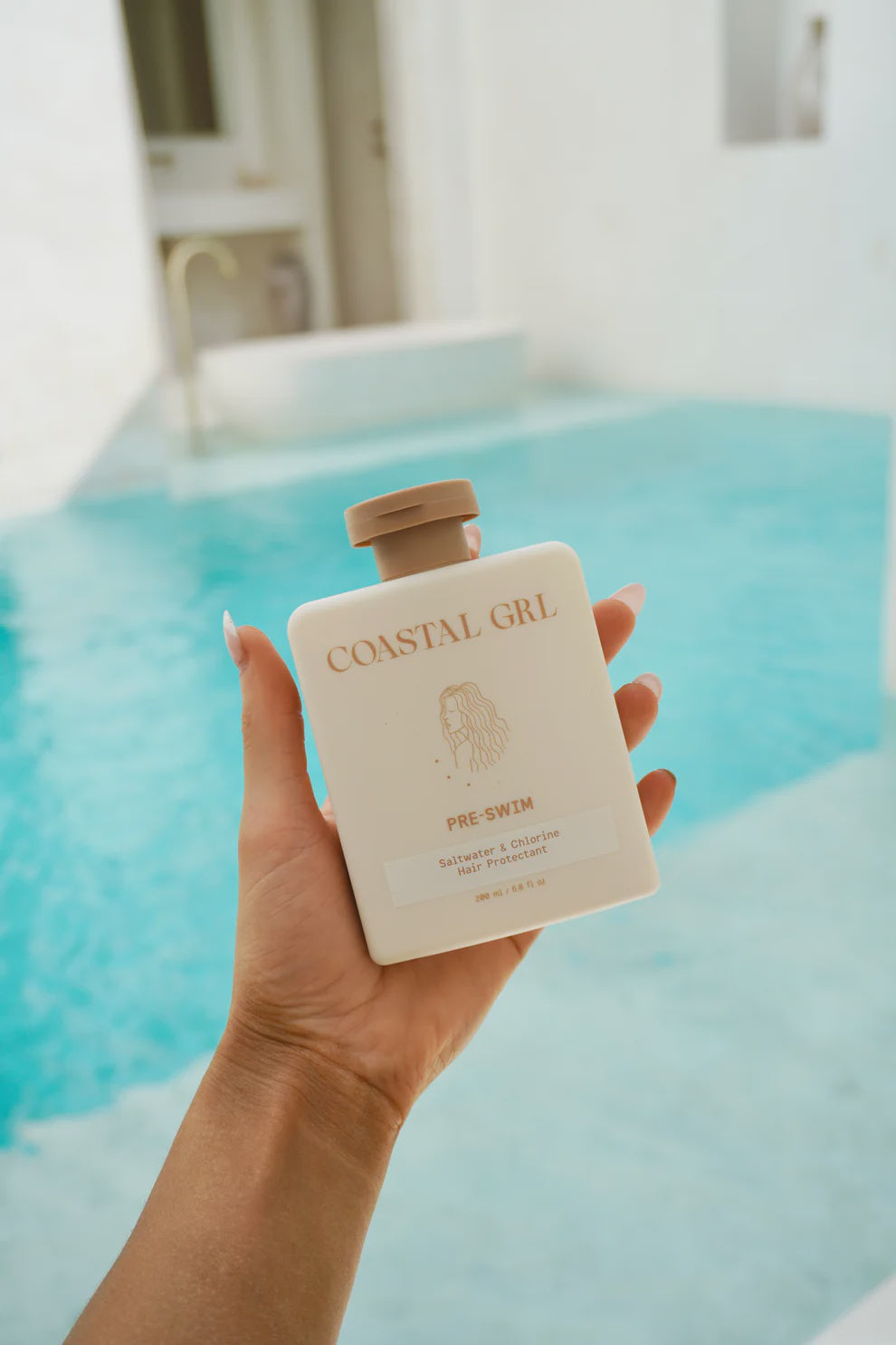 Pre-Swim acts like an invisible swim cap — shielding your hair from the harsh effects of chlorine, saltwater, and UV rays.