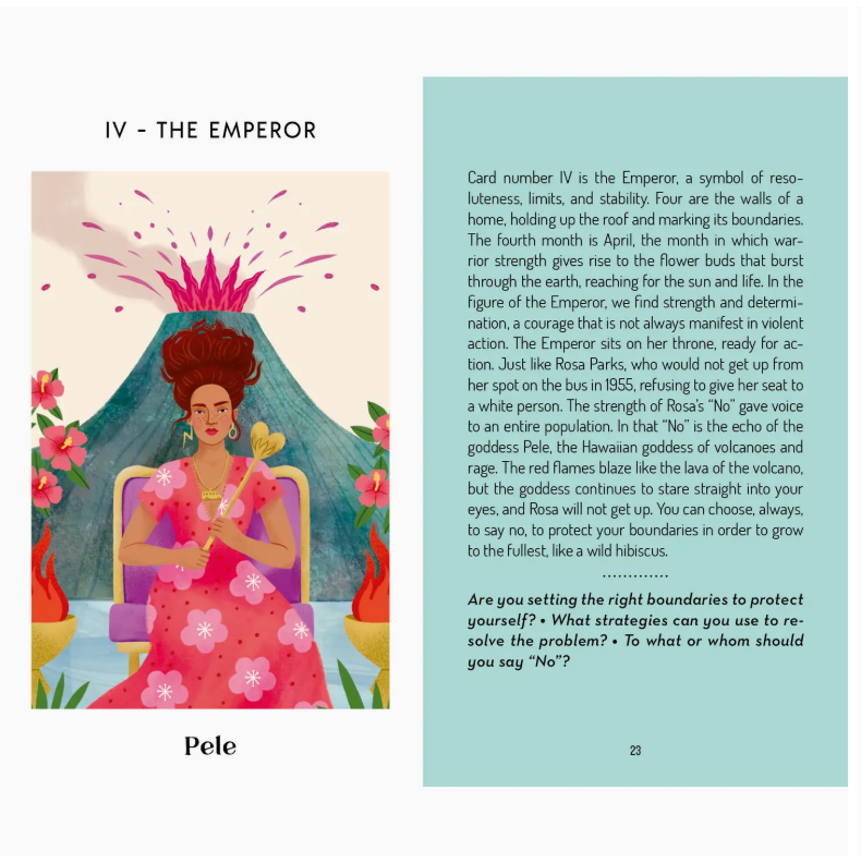 Every woman is a goddess imbued with the power of the Divine Feminine, realized through a lineage of famous females both historical and mythical. This gorgeous deck, stunningly illustrated by internationally famous artist Petra Braun, looks at the classic Rider-Waite tarot through the lens of these goddesses. Instead of the chaotic destructive force of The Tower, we have the beautiful and terrifying Hindu goddess Kali. Instead of The Empress, we have Hawaiian deity Pele, luxuriously clothed in flame. These boldly painted cards are an excellent way to call upon the goddesses when asking questions of yourself, your loved ones, and this world.
