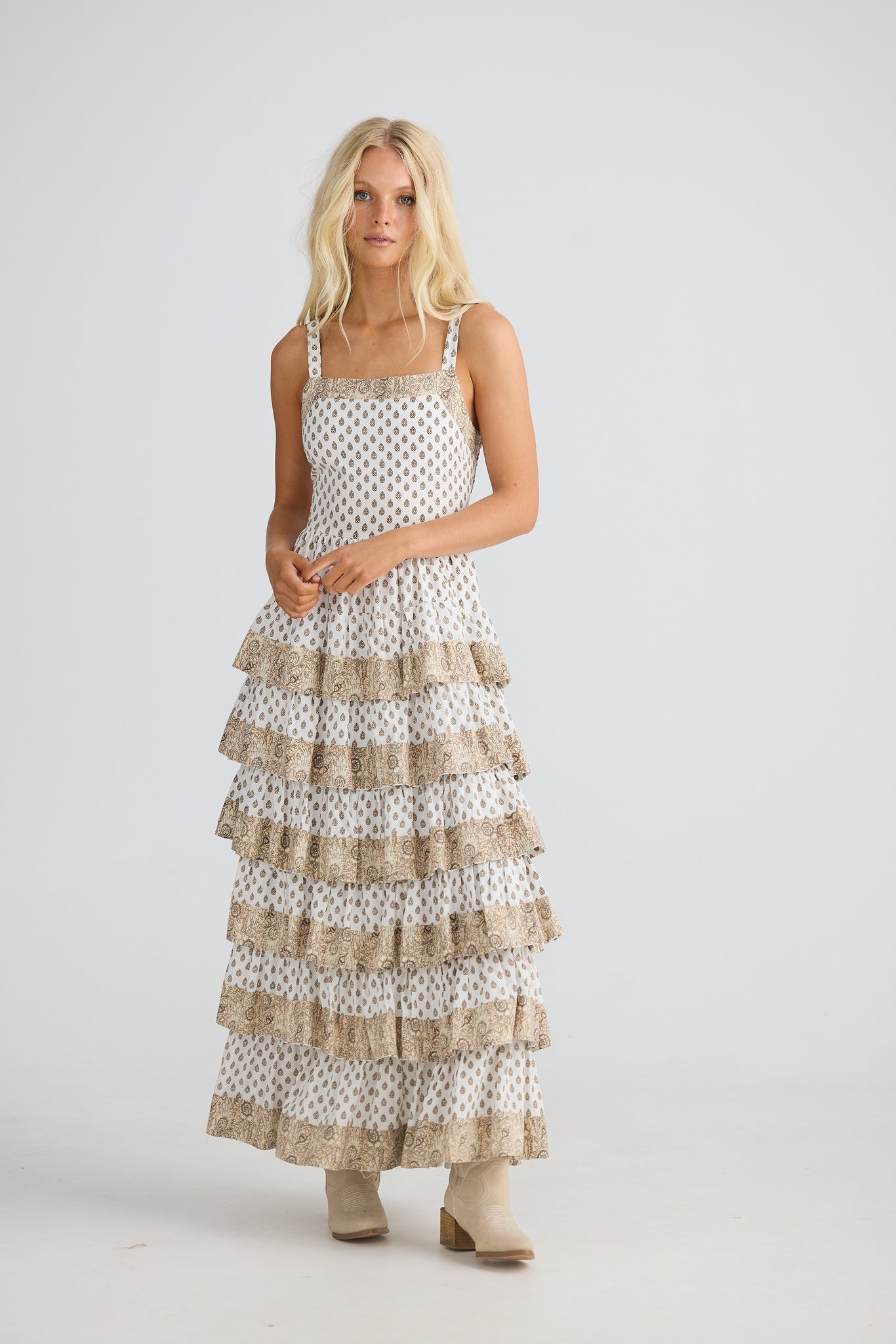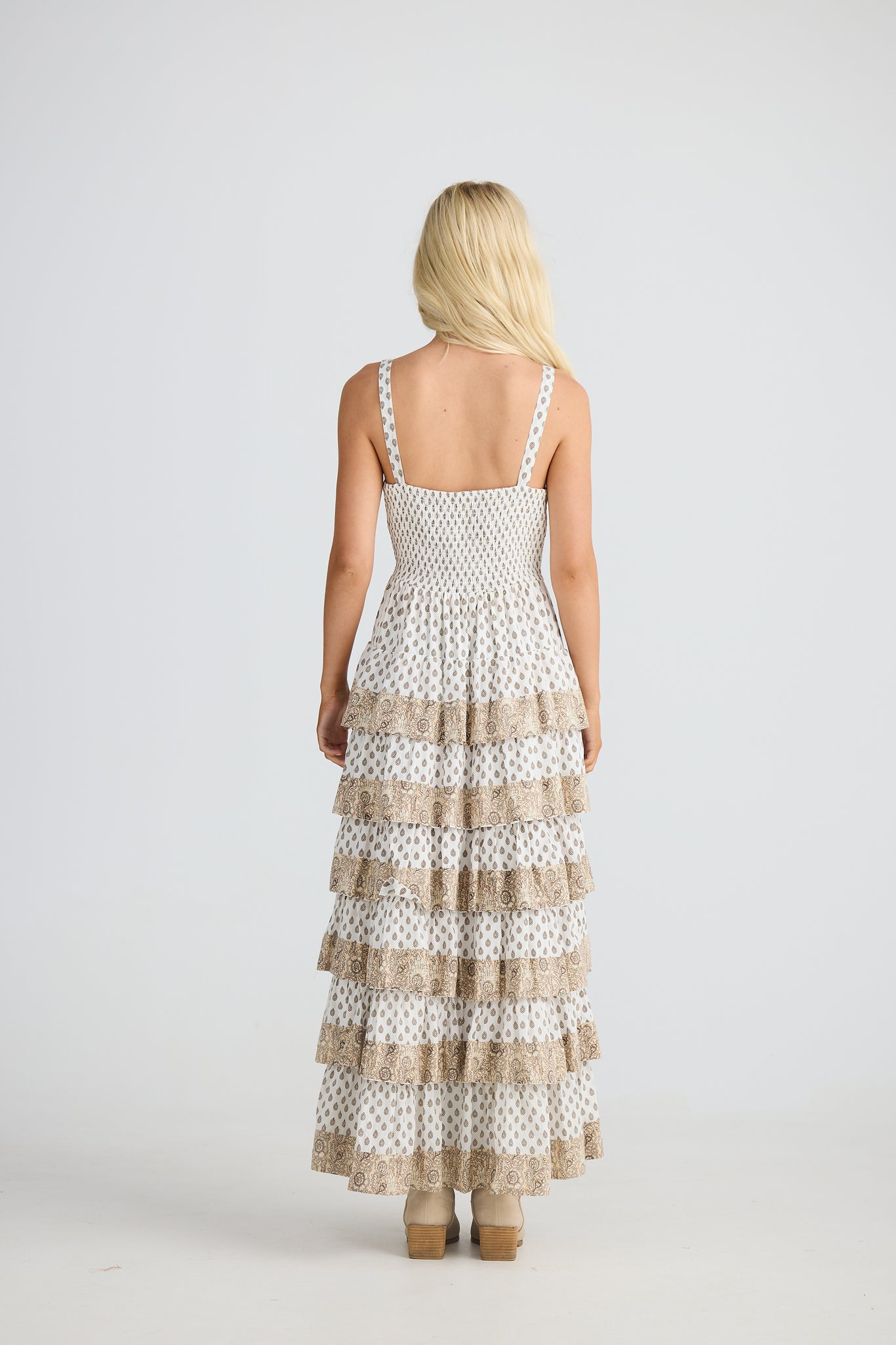 Square neckline with strapsFitted bodice with back shirringSoft gathers along waist seam Tiered maxi skirtContrast border hemLined