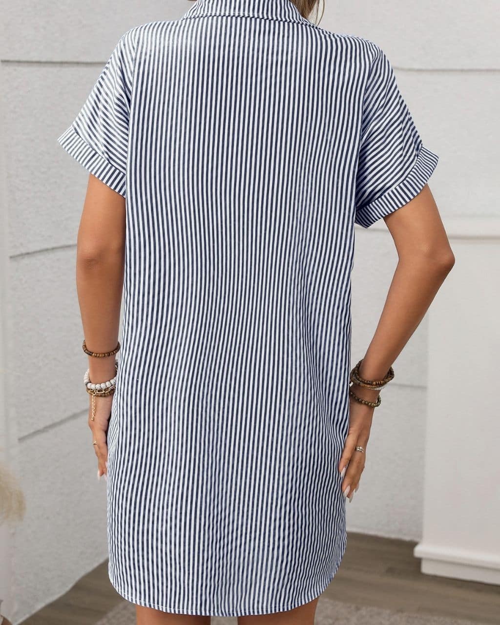 Pair it with sandals for a laid-back look or dress it up with heels and statement accessories for a polished, put-together outfit. A versatile wardrobe staple, this navy stripe shirt dress combines style, comfort, and effortless charm.