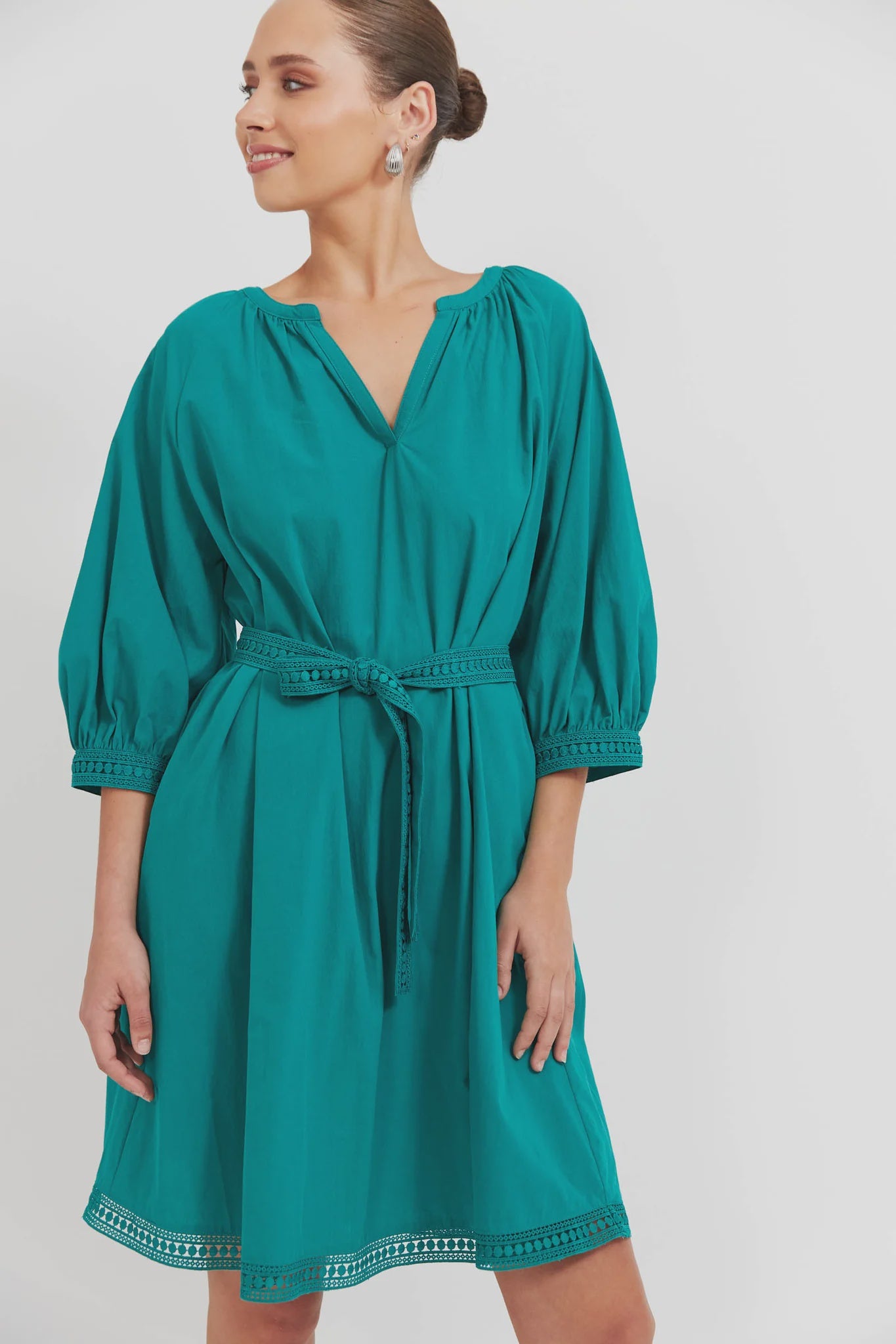 The Santos Dress is crafted from soft, breathable cotton and finished with delicate lace inserts at the hem and sleeves for a subtle, feminine touch. The relaxed silhouette features a V neckline with gentle gathers, 3/4 sleeves for added sun coverage, and a self-fabric belt so you can wear it loose or cinched to suit your style.