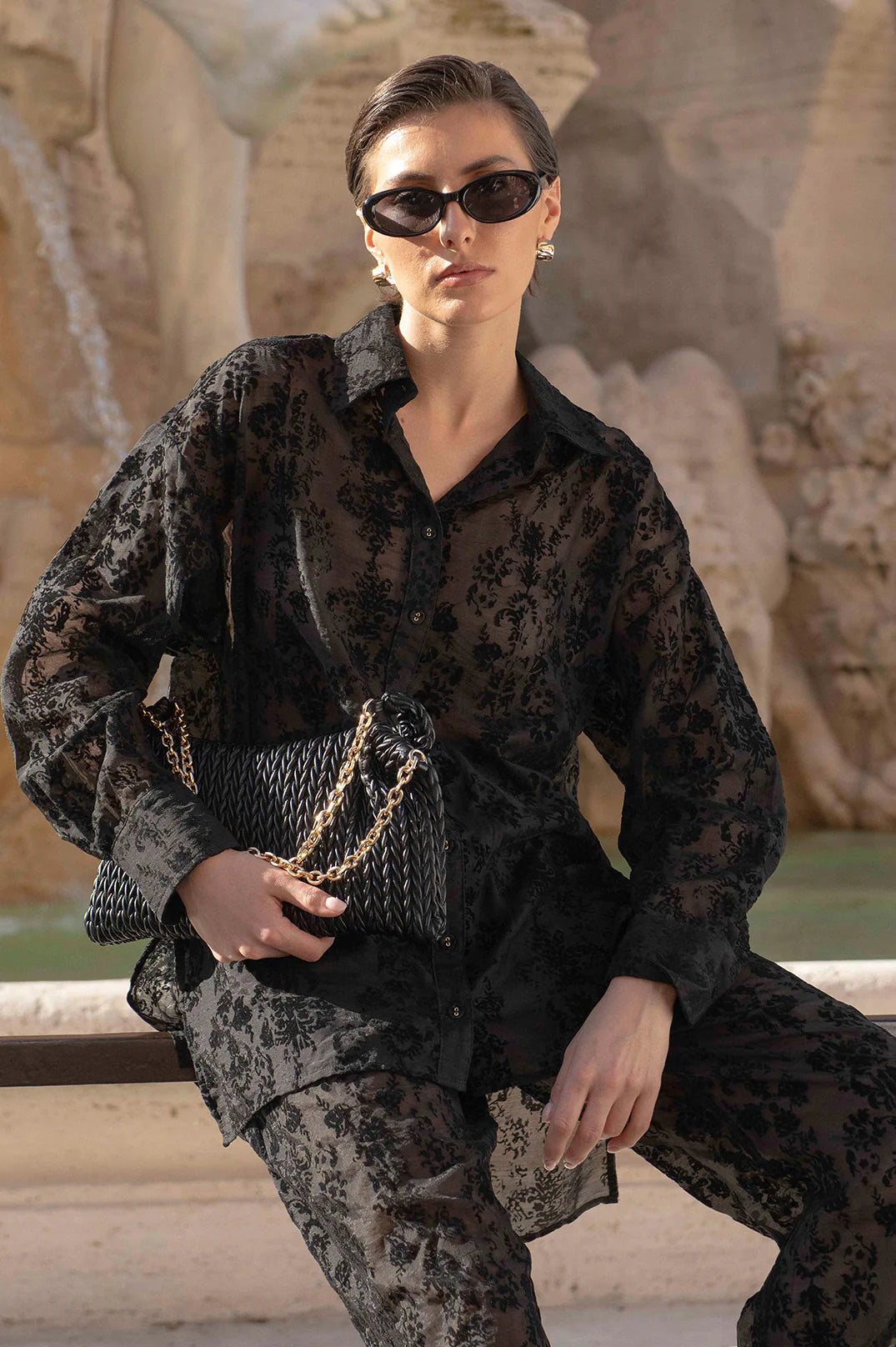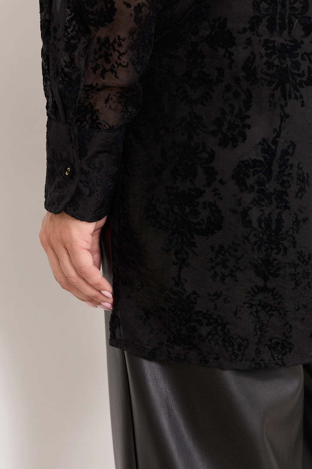 The Estelle Burnout Shirt in Black is crafted in a burnout-textured fabrication with a relaxed fit. Designed with a button-through front, long sleeves with buttoned cuffs, and a curved hem with side splits.