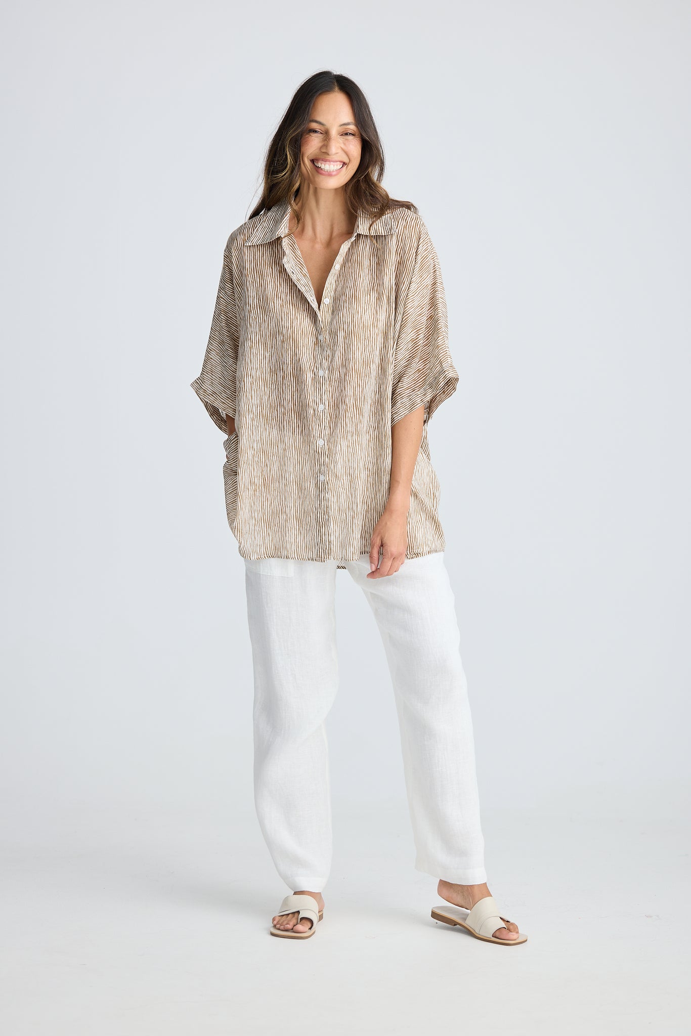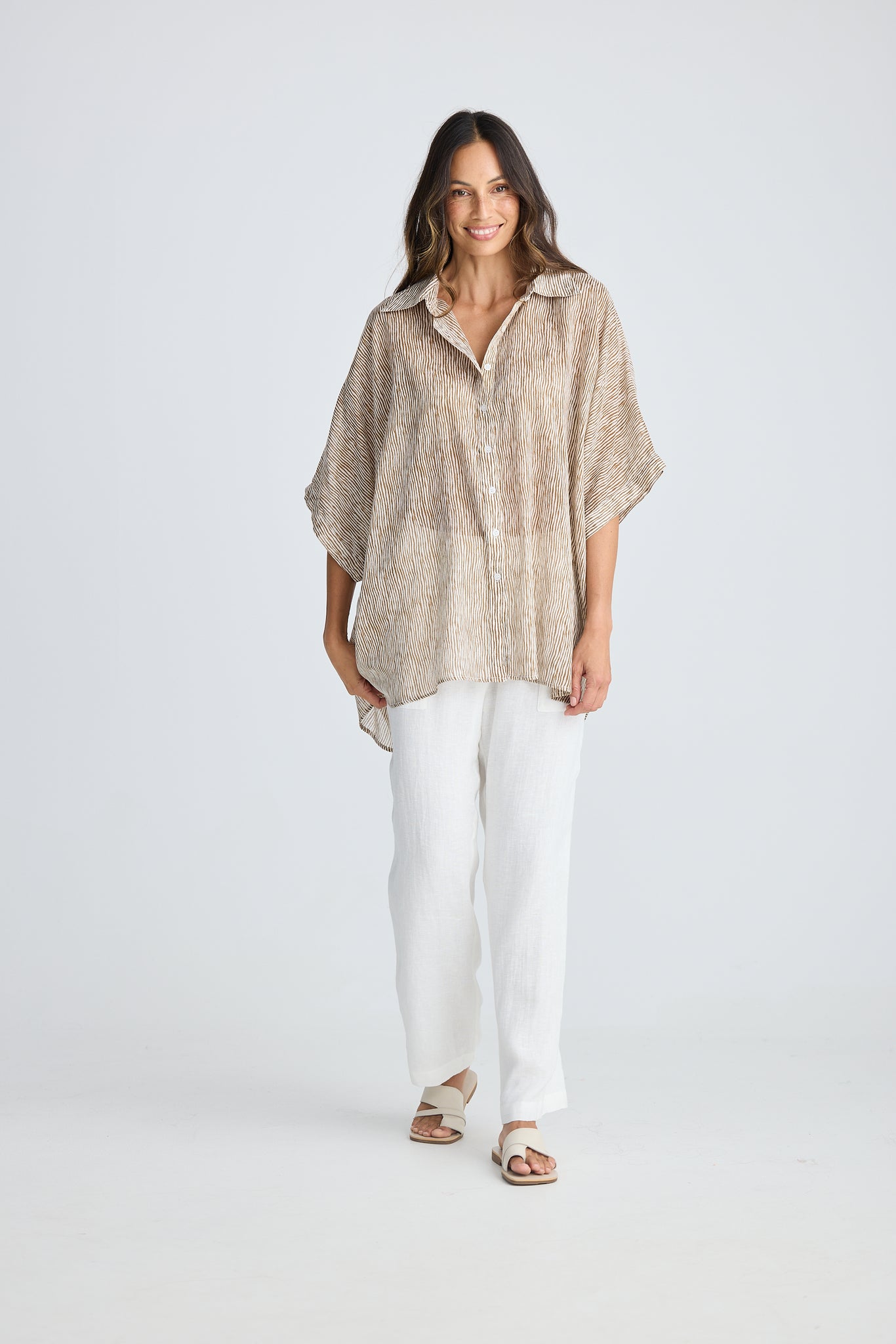 Collared necklineButton through front closureGrown-on short sleeve with cuffRelaxed, oversized fit