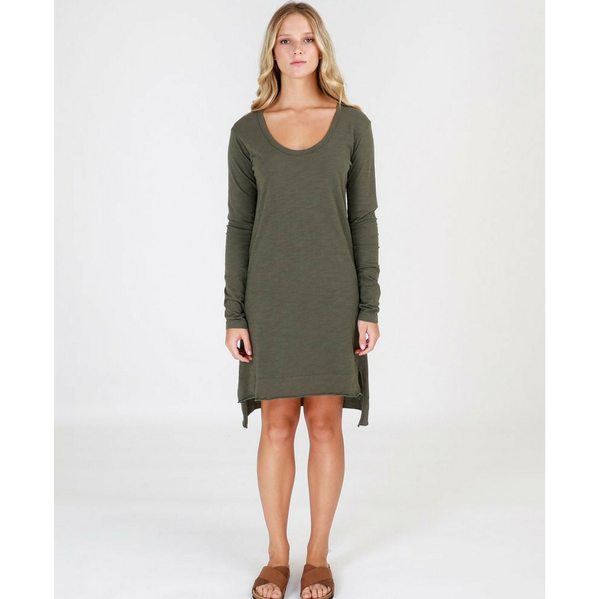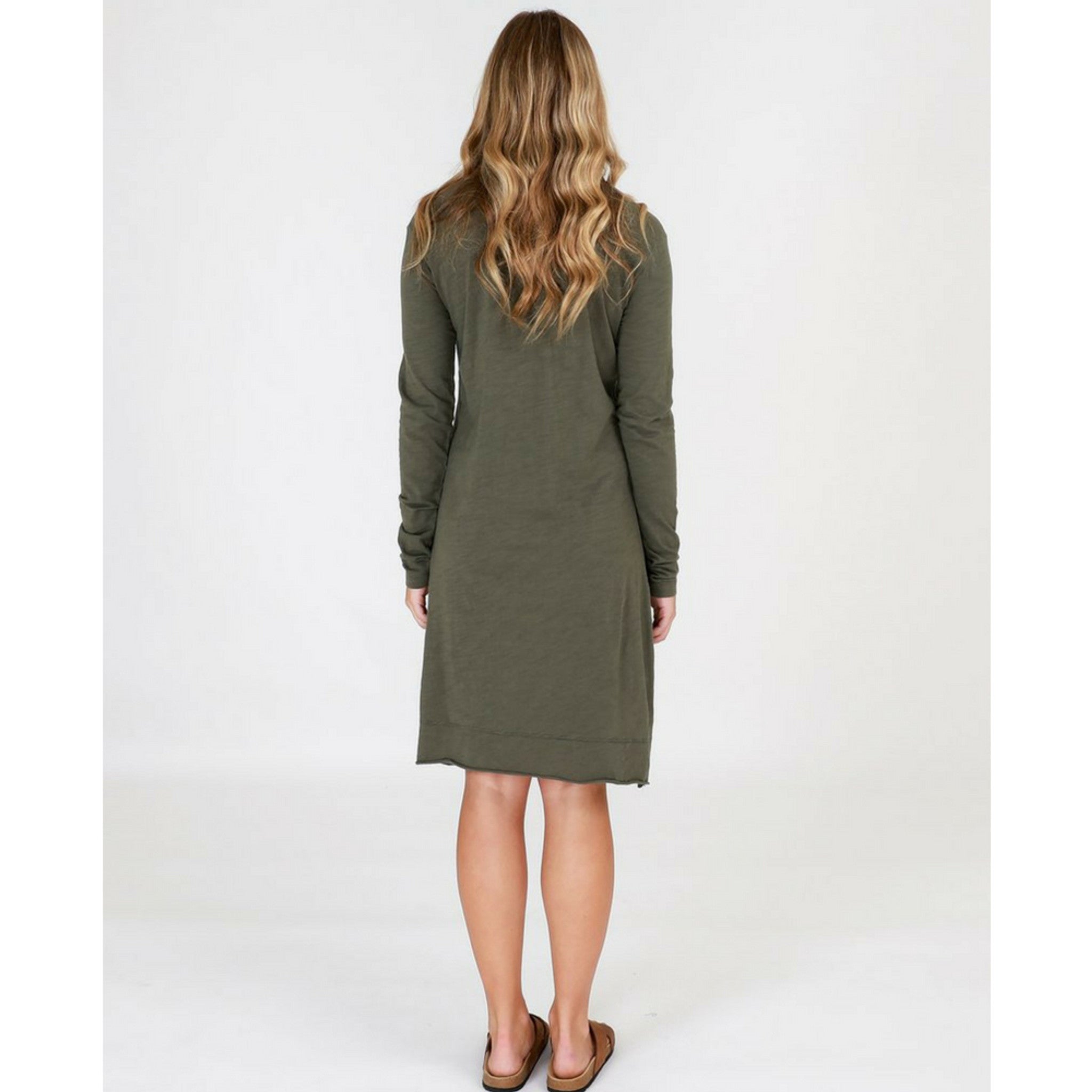 Lorne Tunic in Khaki by 3RD STORY has a rounded scoop neckline and long sleeves. This women’s tunic has a loose and relaxed fit. The straight hemline with split sides falls down to approximately above the knees at the front, and falls just past the knees at the back. Comes in colours Black, Indigo, Khaki, Stone.