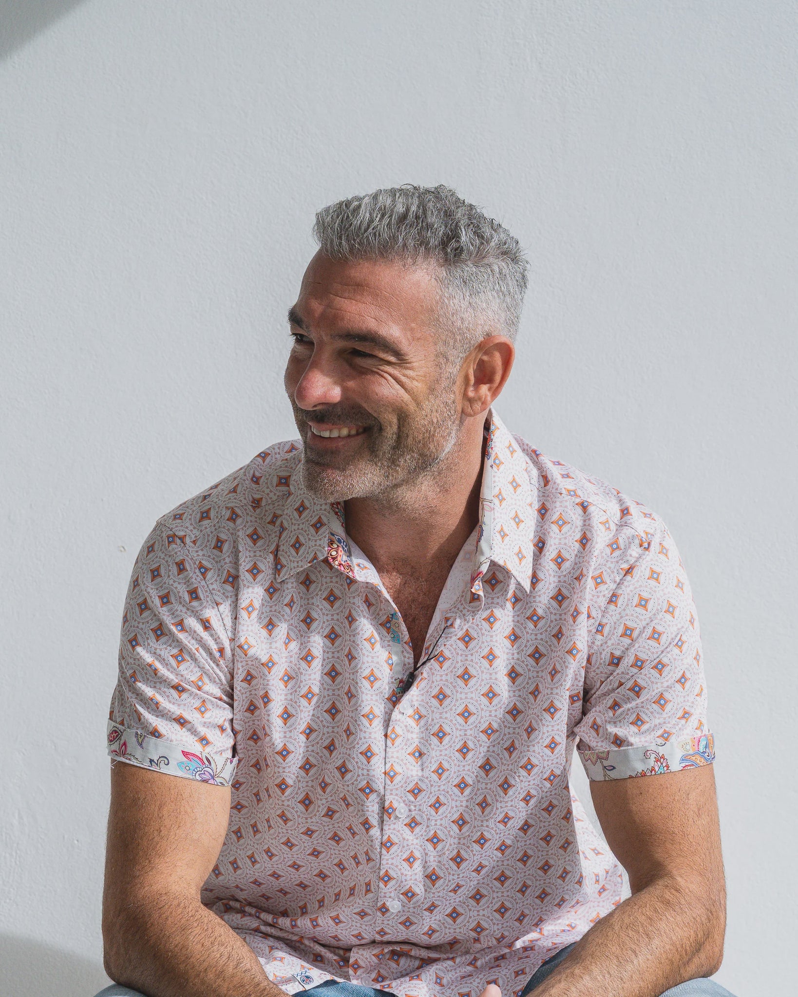 This short-sleeve shirt features an intricate geometric pattern in a subtle colour palette, with contrast paisley pattern internal trim