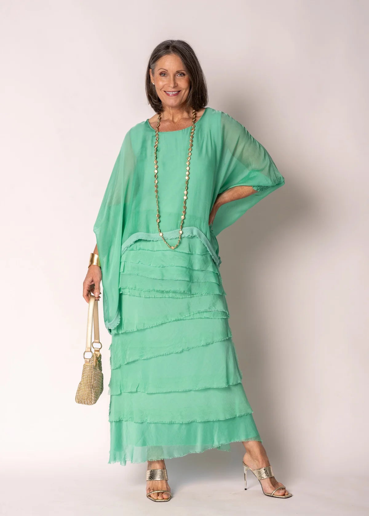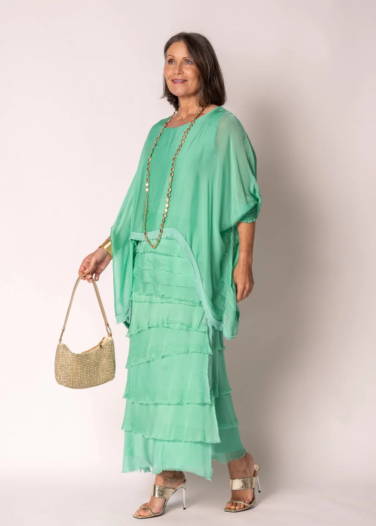 Elevate your charm with the Amulet Silk Top in Capri Green. Luxurious layers of silk cascade down the front, creating a statement of sophistication, while a subtle frayed hem adds a refined finishing touch. Ideal for evening occasions, this silk top exudes elegance and effortless style.